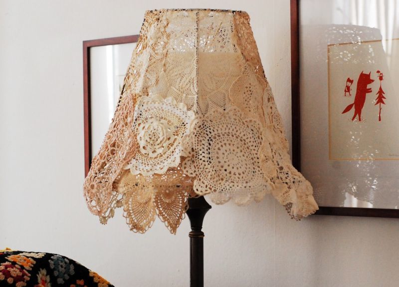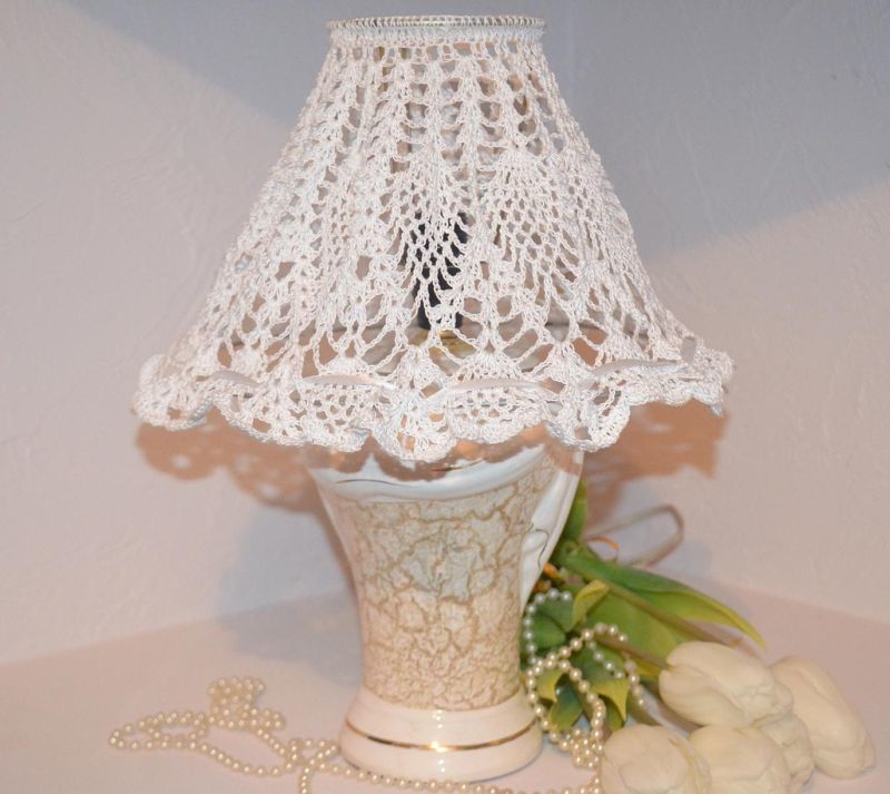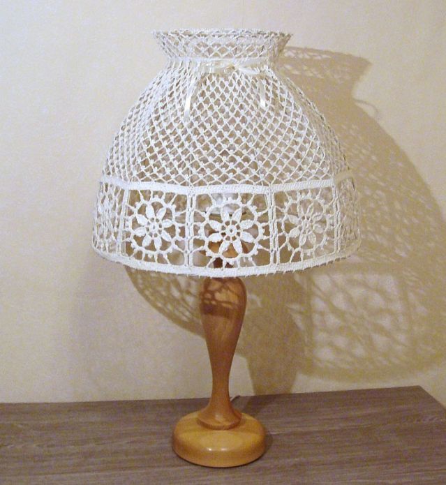 Можете също така да изплетете на една кука абажур за лампа, да поставите готовото изделие върху основата и да го закрепите с лепило или смес от нишесте. За този процес могат да се използват и стари дантелени салфетки, които се избелват, пребоядисват и оформят, но не непременно на топка.