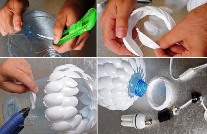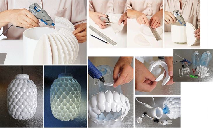 Ако не се знае нищо за топлоустойчивостта на използваните материали, по-добре е да се откажете да ги използвате или да използвате лампи, които не се нагряват. Рамката на абажура може да се изработи от пластмаса, като се използват следните достъпни идеи и много необичайни решения, които ще вдъхновят домашния майстор:
