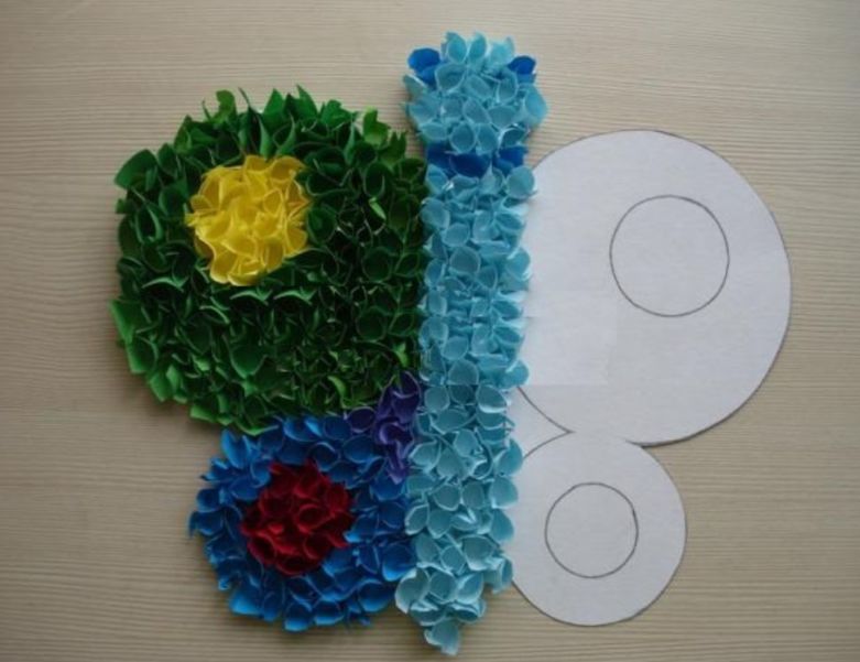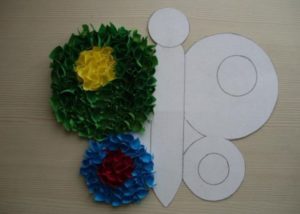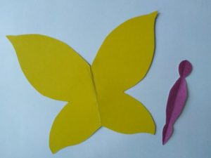 - Свържете всички получени части. Залепете торса към малката пеперуда и го прикрепете към голямата пеперуда.
