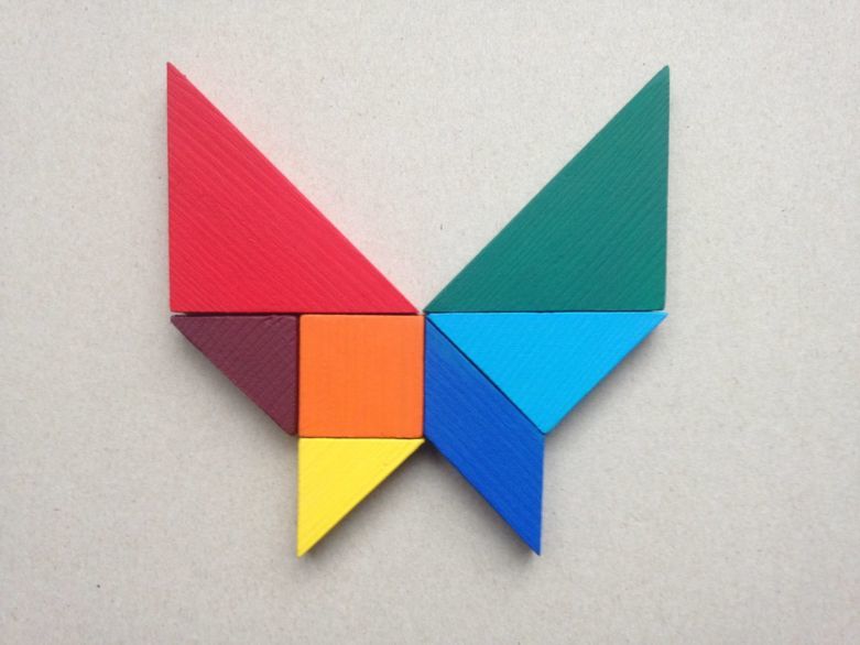 - Децата трябва да кажат имената на фигурите, да помислят как да ги подредят, за да се получи пеперуда, и да обяснят решението си.