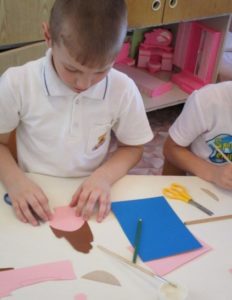 Към този етап обаче трябва да се подходи, ако детето вече е уверено в използването на ножици и лепило, така че да може самостоятелно да избере какво и къде да залепи.