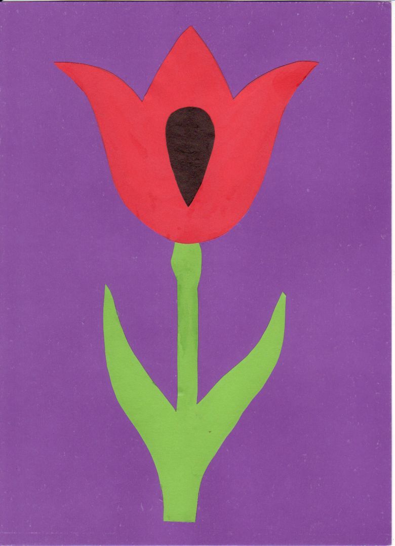 - Тревата, стъблото и листата са изрязани от зелена хартия. Сърцевината е изрязана от жълта хартия.
