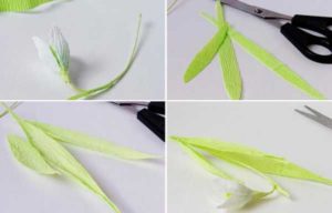 - Стъблата са завити от зелена хартия, а листата и чашелистчетата са изрязани.