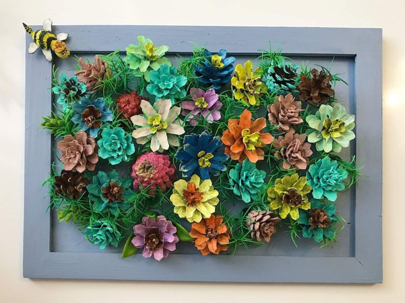 Нека направим букет от цинии от естествени материали. Необходими са шишарки, тополови клони, листа, картон, лист хартия, лепило, ножица и боя:
