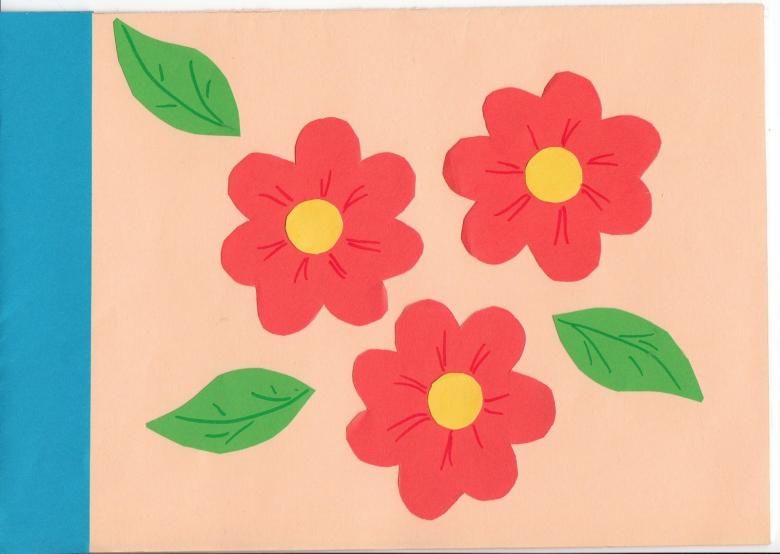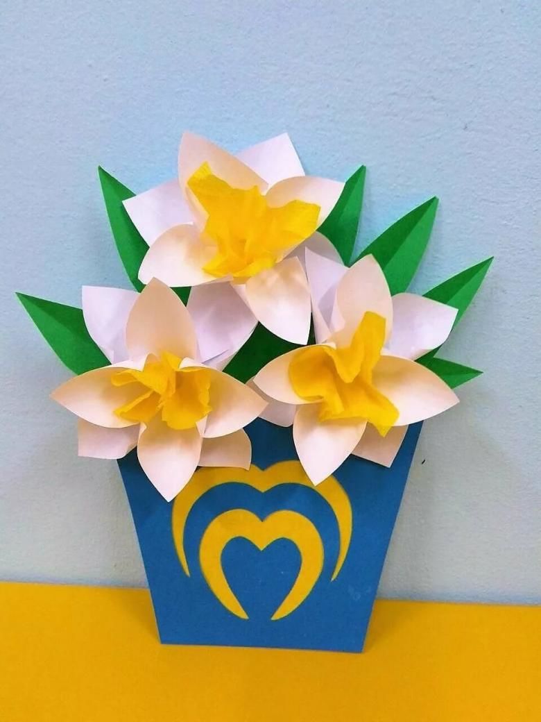 - Изрежете ваза от декоративна хартия. Листата са изрязани от зелена хартия. С помощта на цветни флумастери очертайте жилките на венчелистчетата.