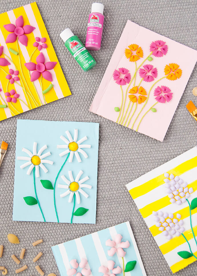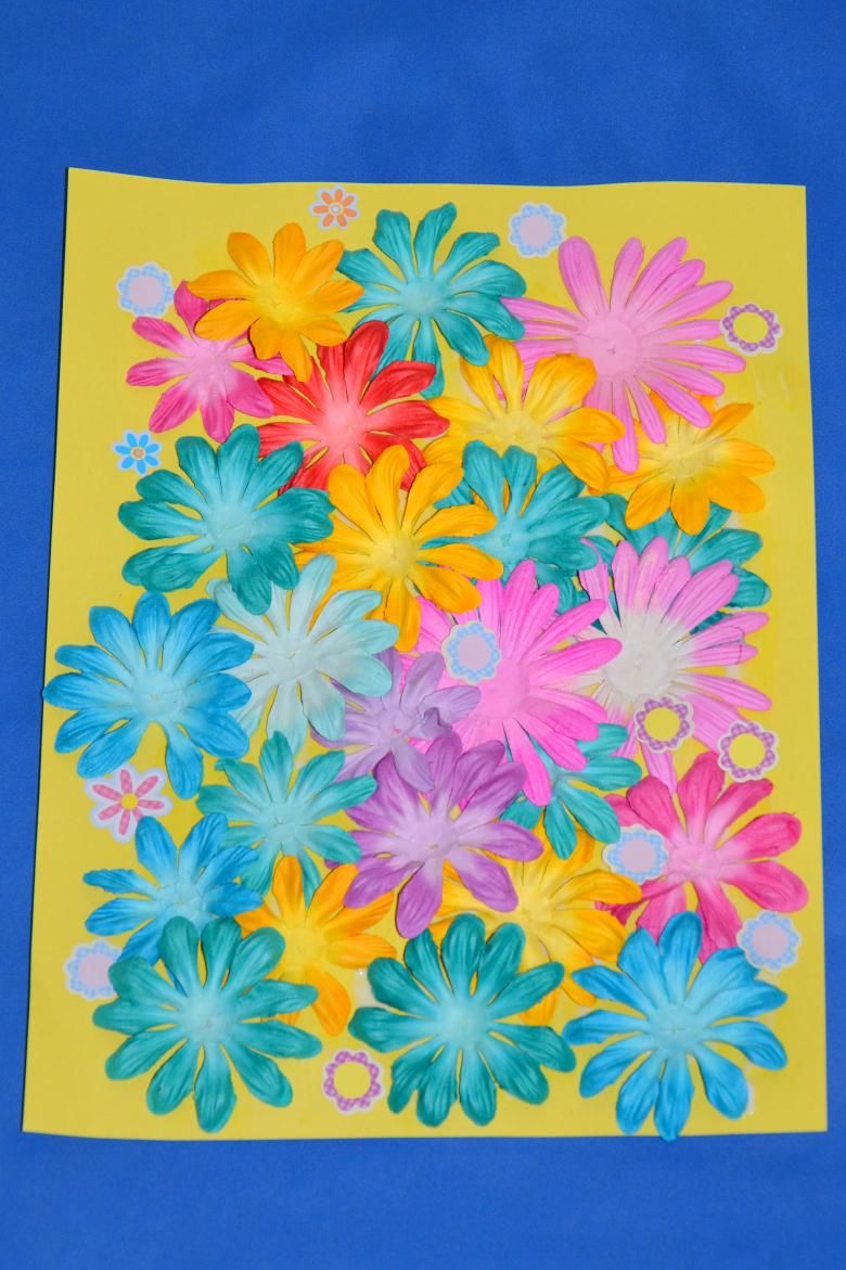 Нека се опитаме да направим флорална композиция върху парче картон. Тя ще включва няколко различни цветя с венчелистчета и трева.