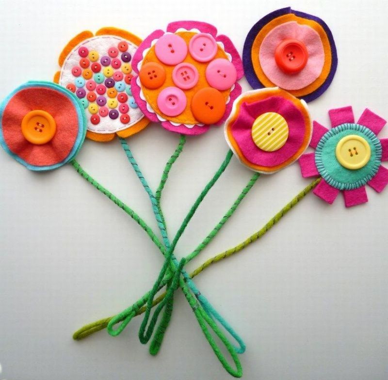 За да си направите апликация от цветя от филц, ще ви трябват шаблони за цветя, конец и игла, лепило, ножица и филц. Това може да бъде предложено на децата от средната група. Има няколко варианта за създаване на цветя от филц: