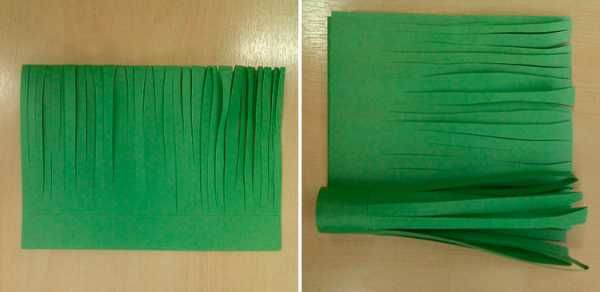 - За да се създаде различен вид трева, тя се нарязва на равни парчета, след което всяко парче се сгъва отгоре и се залепва за фона.