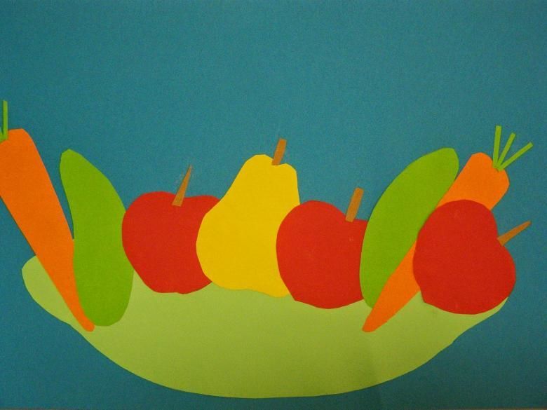 В този случай детето, разбира се, няма да се справи без помощта на възрастен, но съвместното време, прекарано заедно, си заслужава. Ако всички необходими фигурки на зеленчуци и плодове са предварително подготвени и изрязани, по-нататъшната работа може да бъде извършена от детето съвсем самостоятелно.