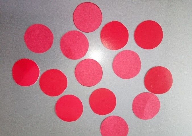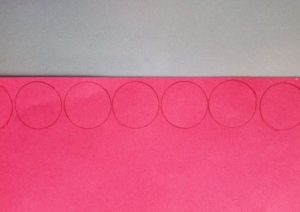 - От червен лист хартия се изрязват четири кръга с диаметър пет сантиметра.
