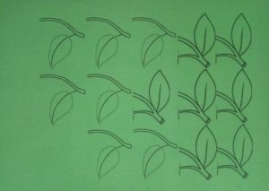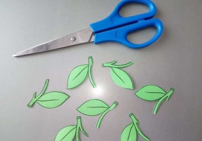 - Изрязват се листове от зелена хартия, след което се сгъват в средата.