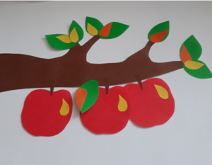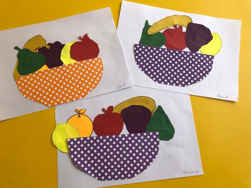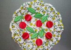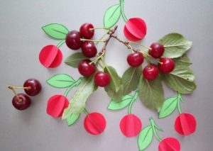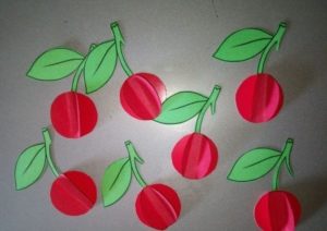 - Плодове върху хартия. Когато хартиените изделия са готови и изрязани, те се залепват върху картон, където детето може да използва цветни моливи, за да довърши опашките и листата.