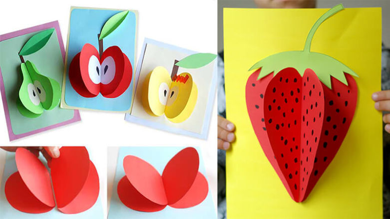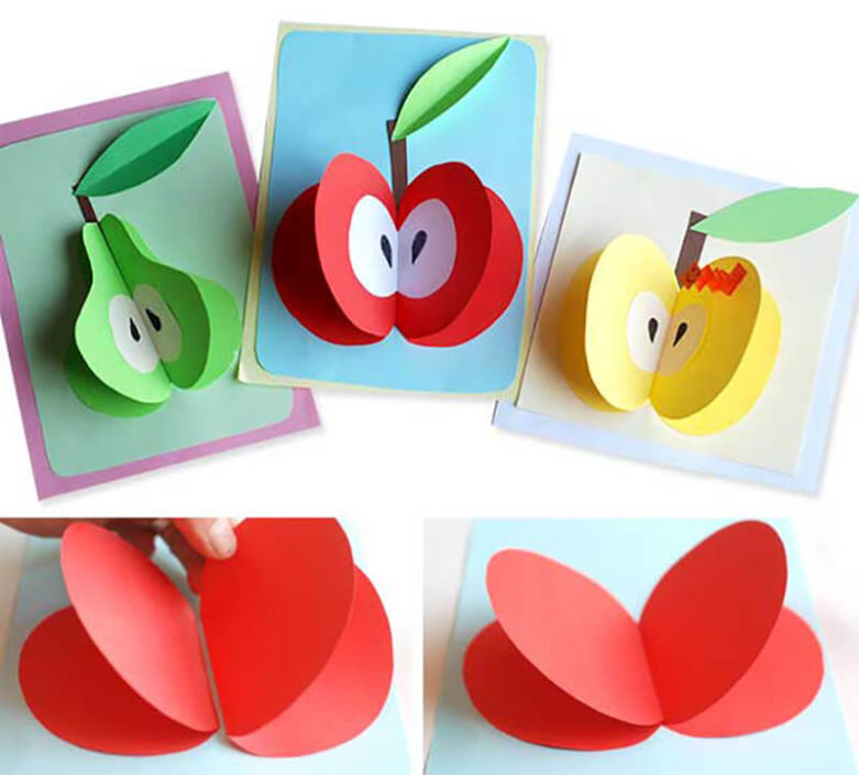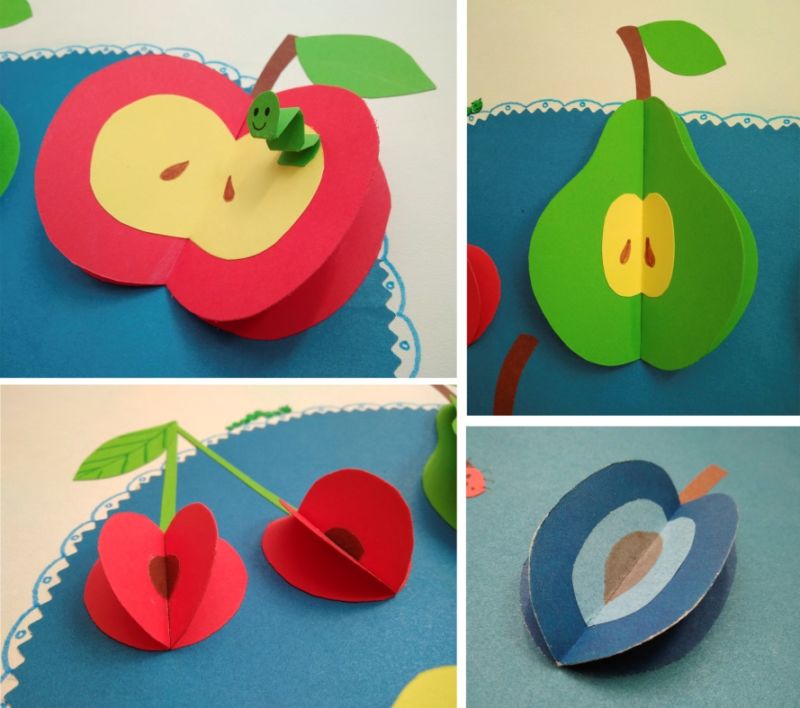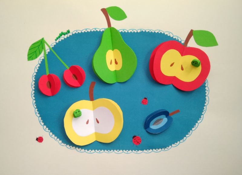 Детето както в предучилищна, така и в начална училищна възраст винаги с ентусиазъм откликва на идеята да направи необичайна апликация от плодове от цветна хартия. За това ще са подходящи различни техники, защото всяко произведение ще изглежда уникално, още повече, че е направено от ръцете на едно дете. Те могат да бъдат направени под формата на: