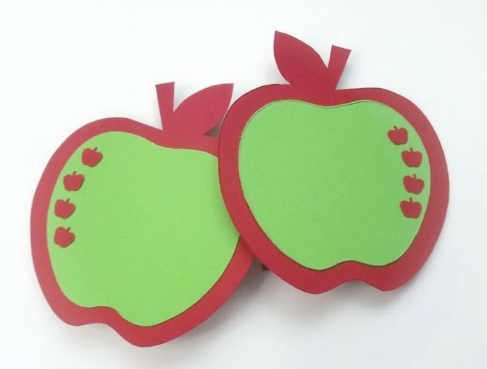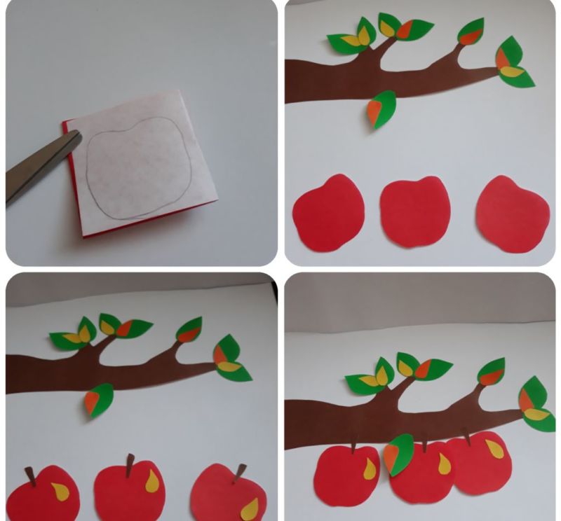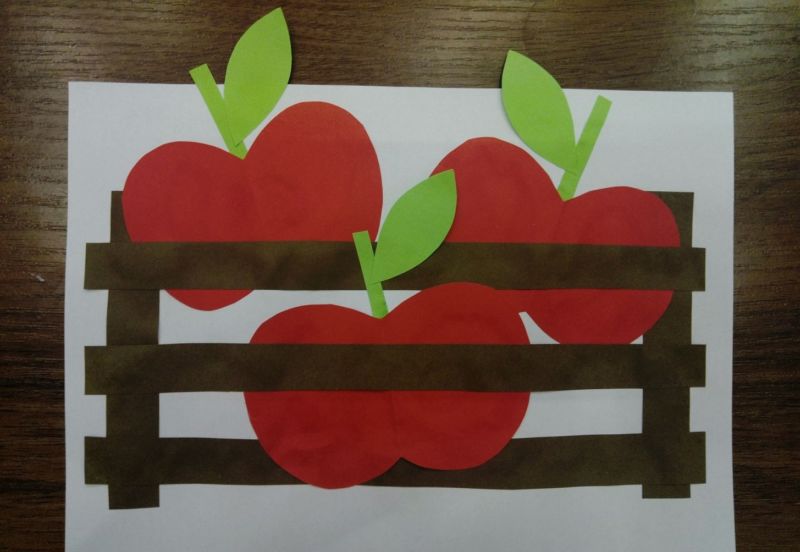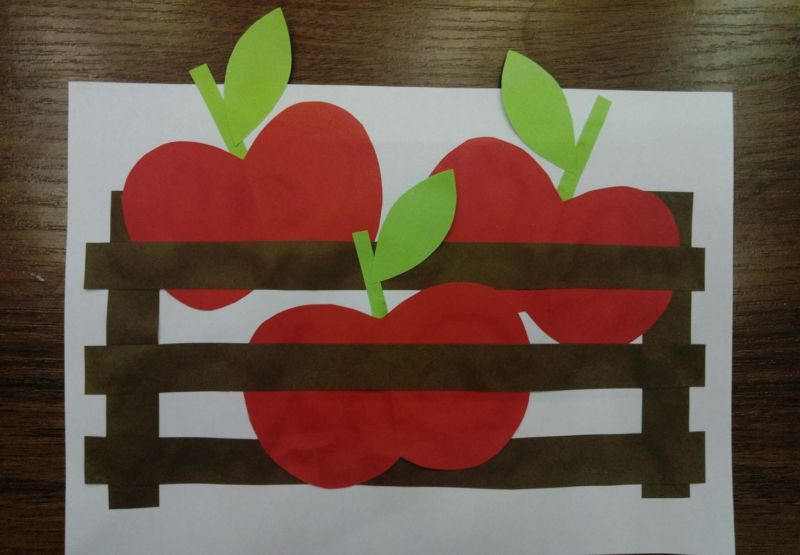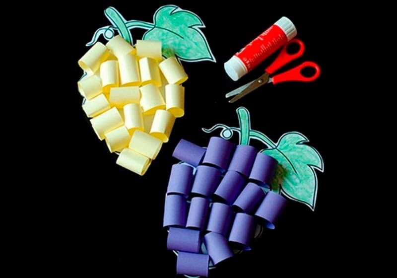 - Обикновена хартиена апликация върху картонена основа. За изработката им се нуждаете от обикновен комплект цветна хартия и шаблони, които да имитират оригинала по форма и размер. Първоначално започнете с по-простите форми - ябълка, круша, грозде, слива, кайсия, череша. В този случай на детето ще му е по-лесно да ги направи, тъй като често ги вижда.