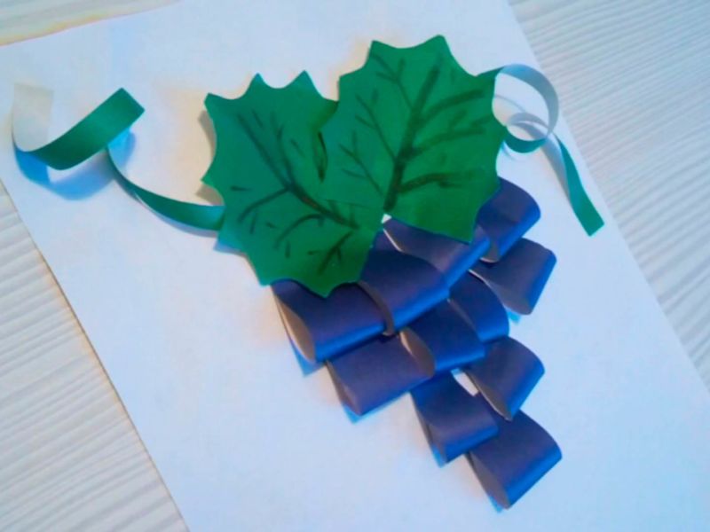 Ето как ще изглежда приложението "Грозде". Можете да разнообразите плодовете, да добавите син цвят. За целта изрежете сини ленти, които също се усукват на пръстени.