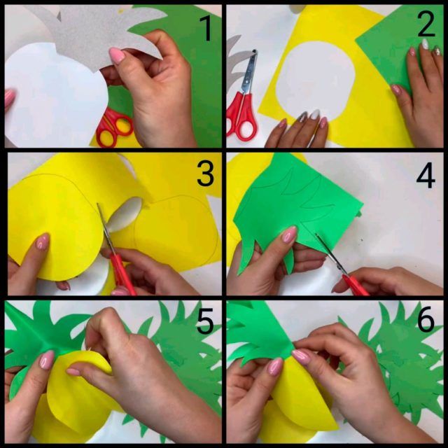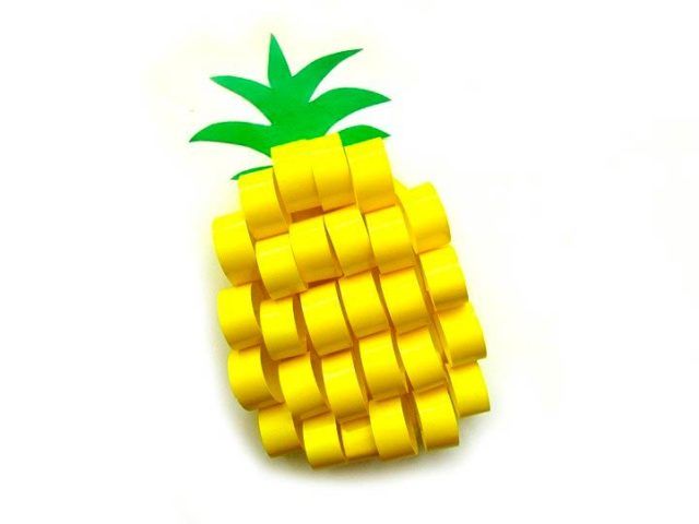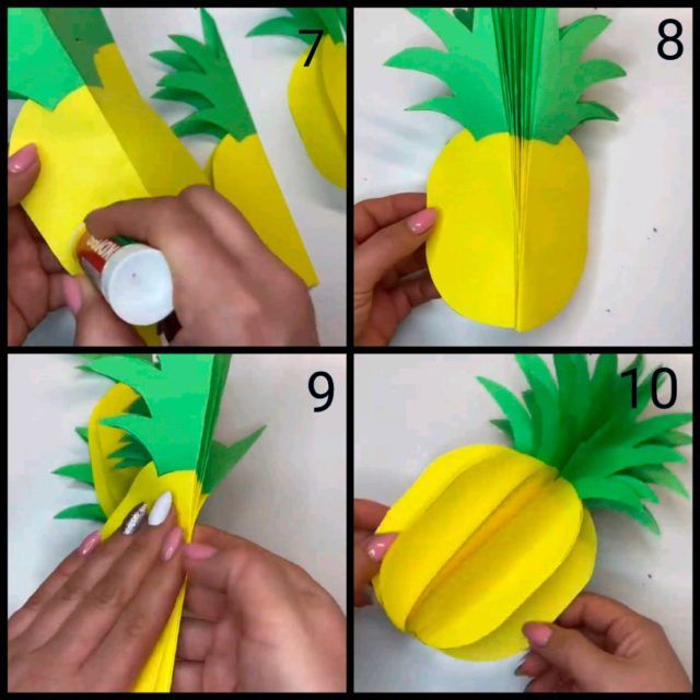 Да знаете как да направите ябълка, да направите ананас не е трудно. Повторете действията, описани по-горе, докато тръбата на хармониката не се превърне в кръг и се залепи към картонена основа. След това трябва да направите следното: