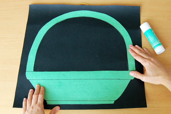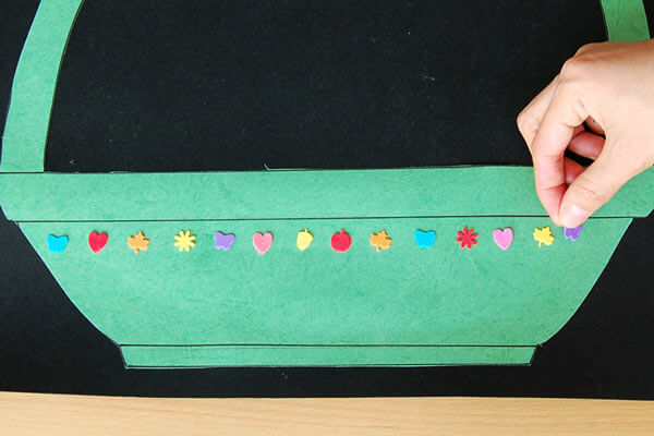 За да завършите апликацията, залепете парчетата в шаблонната ваза с плодове.