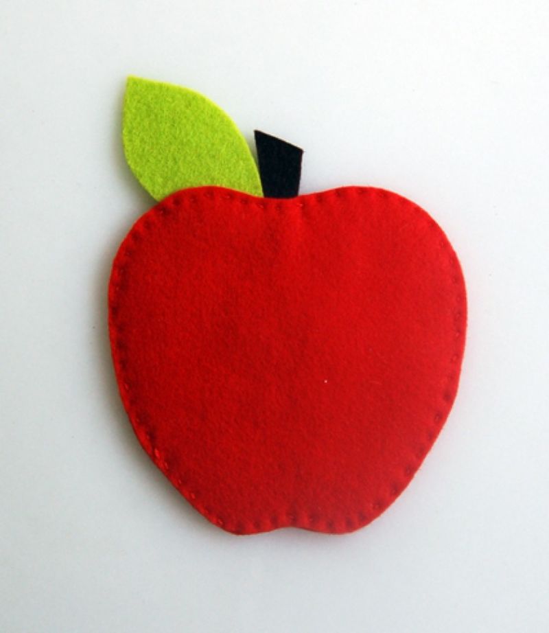 Когато всички са изрязани, започнете да залепвате половинките. Отгоре залепете предварително подготвените опашка и листа. Всичко е апетитно, триизмерната ябълка е готова.
