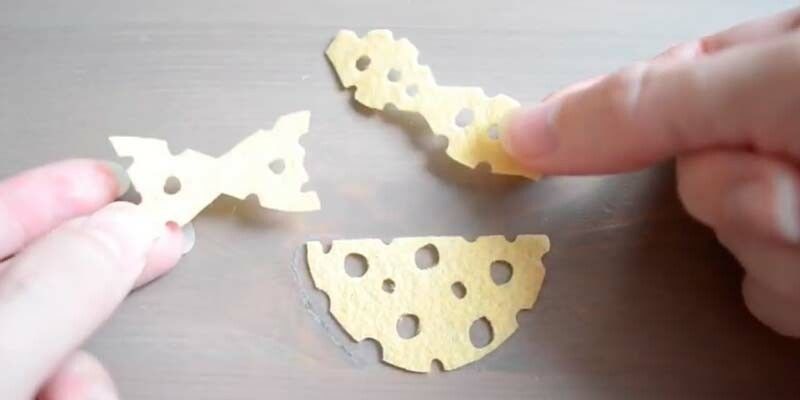 - Изображението на сирене се предлага да се направи от жълт квадрат, като се направят 2 големи дупки с ножица, 2 от тях с перфоратор (ще бъдат идеално плоски), а отстрани да се направят закръгления.