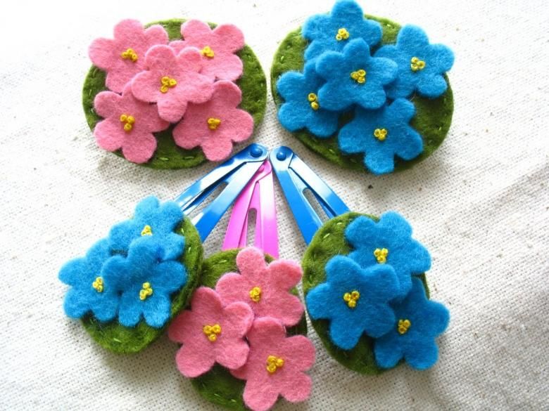 Украсете детската лента за глава и фибите за коса с цветя от филц.