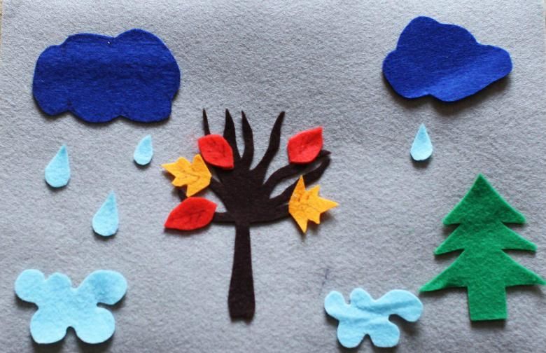 Насърчавайте децата да правят нови елементи за разнообразие. Слънце и облаци с капки от блестящи мъниста или перли - промяна на времето. Снежинки от бяла хартия, снежни преспи и снежни шапки за дърво от памучни дискове - за зимен пейзаж.