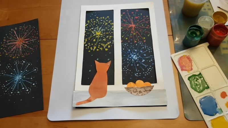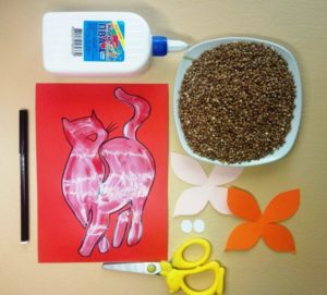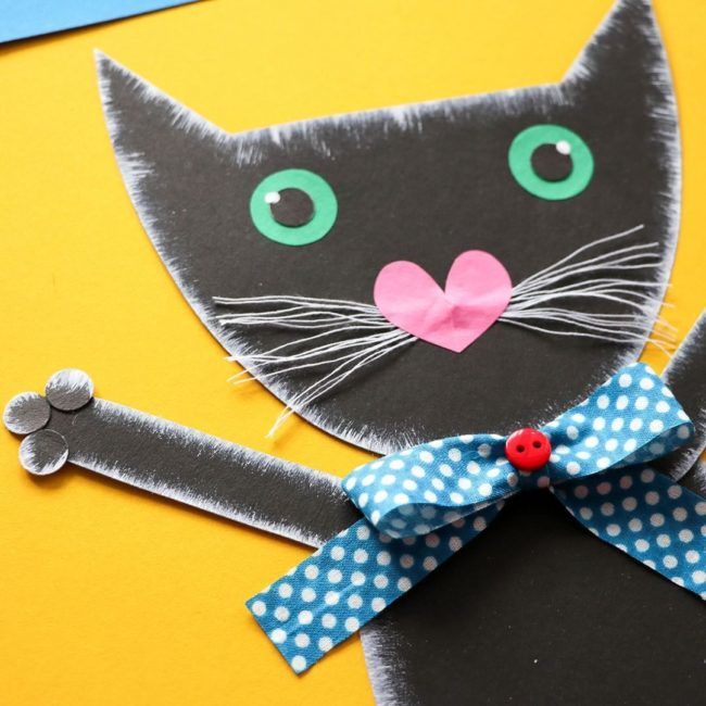 - залепете частите на котката върху картон, украсете картата с бели и червени стрелки.