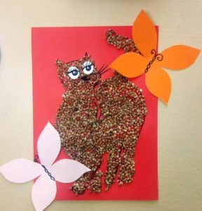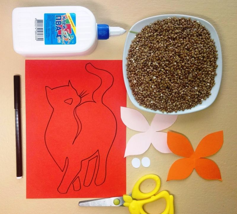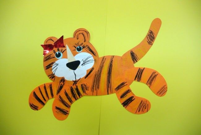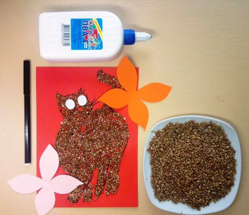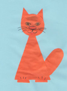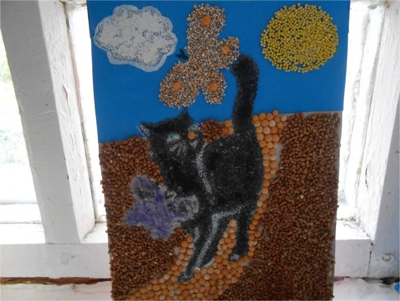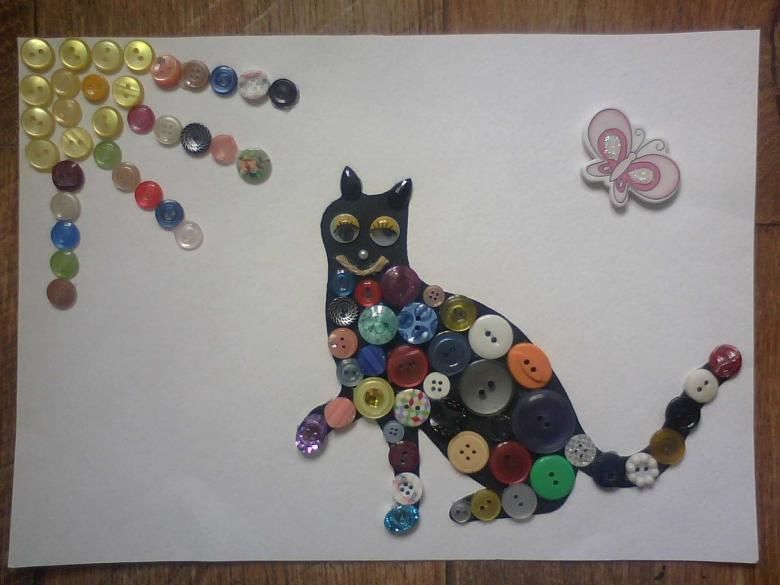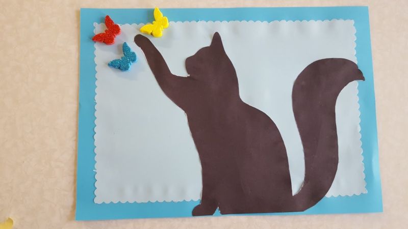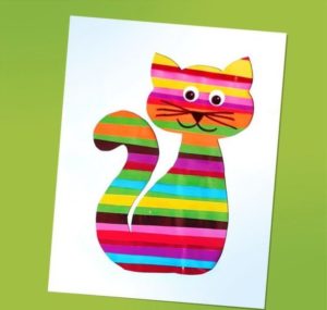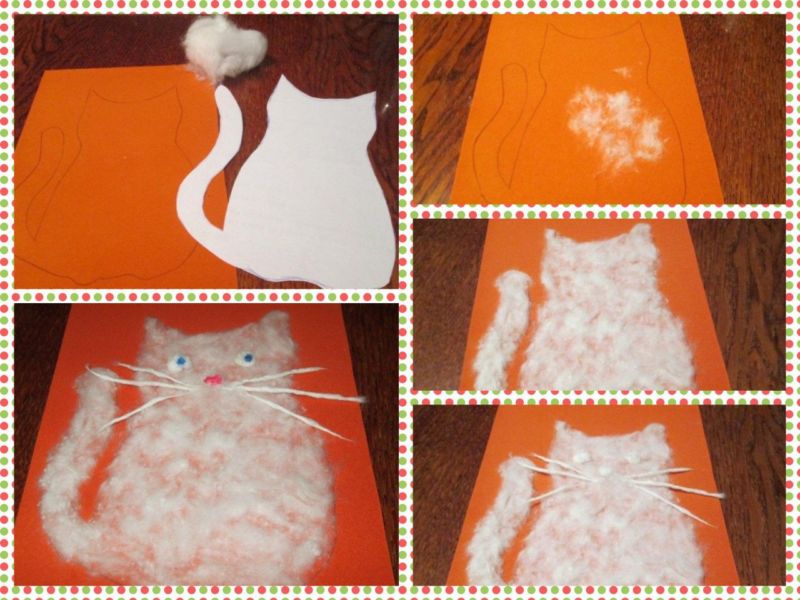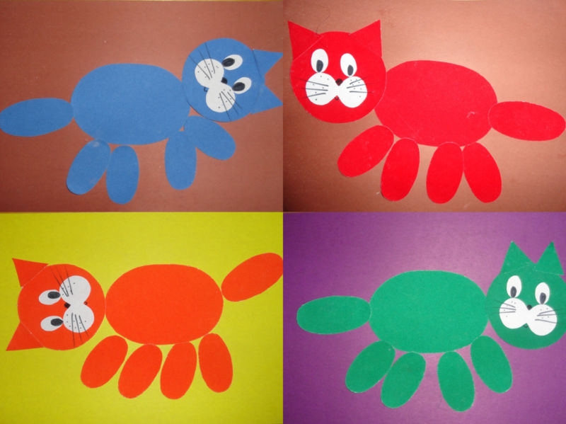 За да си направите добре познат анимационен герой, залепете предварително изрязаните части по шаблон върху произволен цветен картон. Използвайте различна техника: снимка на котка, която се оцветява, нарязва се на части, за да се направи пъзел, и готовите части се залепват на фона.