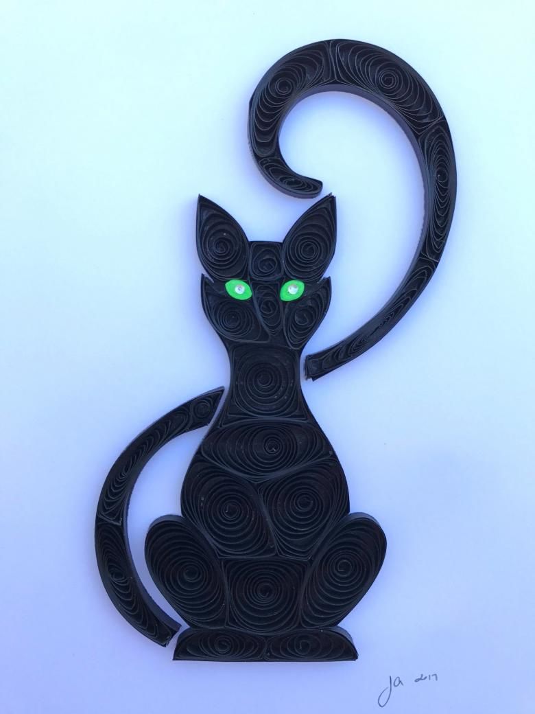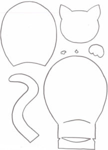 - нарисувайте котката на бял лист хартия или разпечатайте шаблон, изрежете го от вътрешната страна, така че да се получи силует върху хартията, формата трябва да отговаря на размера на лентите;