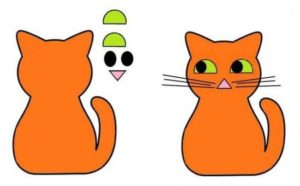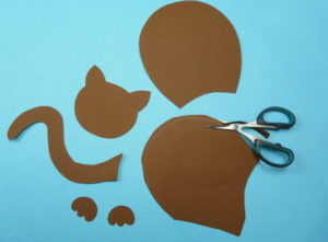 - първо нарисувайте и изрежете необходимите части на котката от цветна хартия: торсът и ушите трябва да са бели, другите части трябва да са червени или оранжеви, носът остава черен;