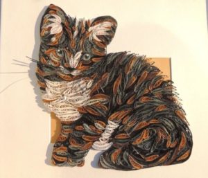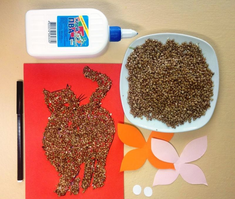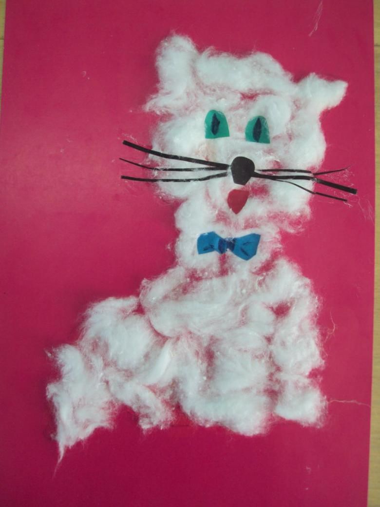 За да направите такава котка, пригответе пластилин с подходящи цветове, шаблон и използвайте необходимите материали: цветна хартия, макарони, конци и памук.