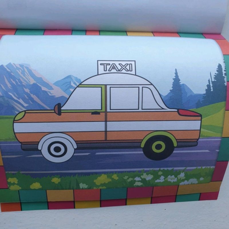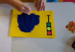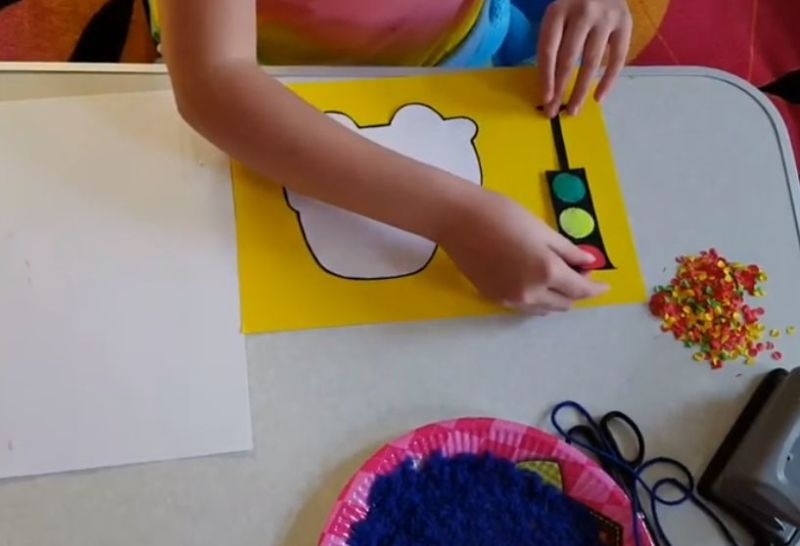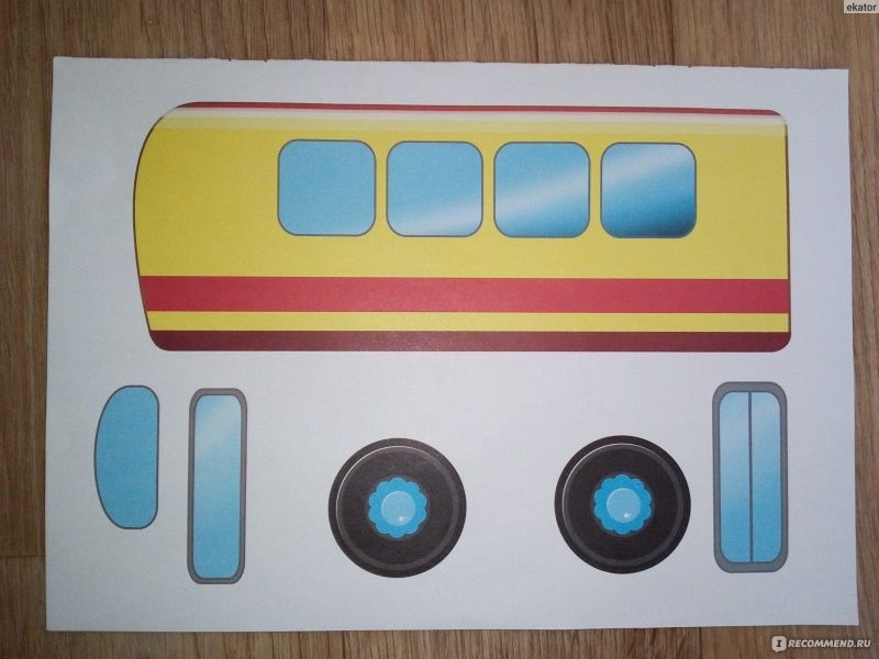 Първото нещо, което децата правят, е да залепят тялото върху основата. След това двете черни външни гуми и централната гума. Добавят се два прозореца, стълбище и накрая жълта светлина на върха.