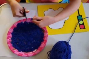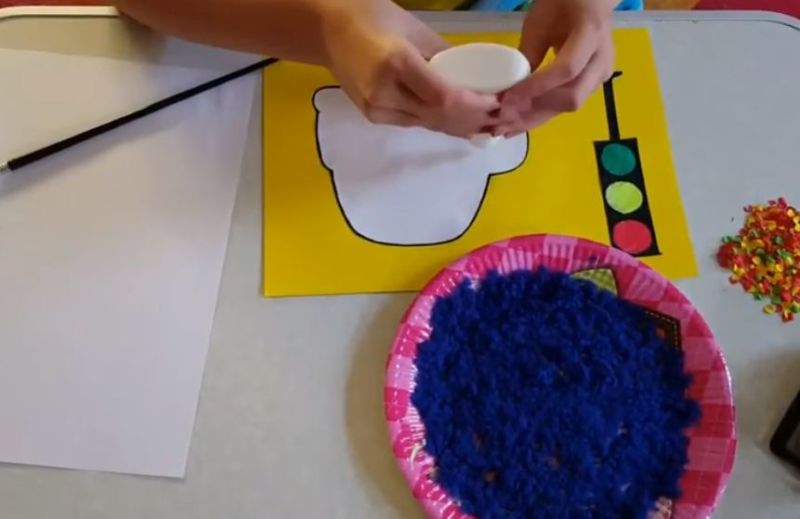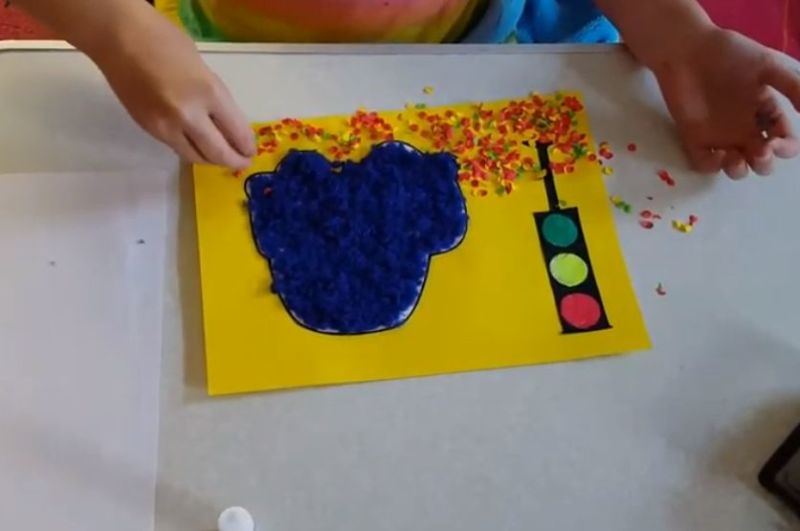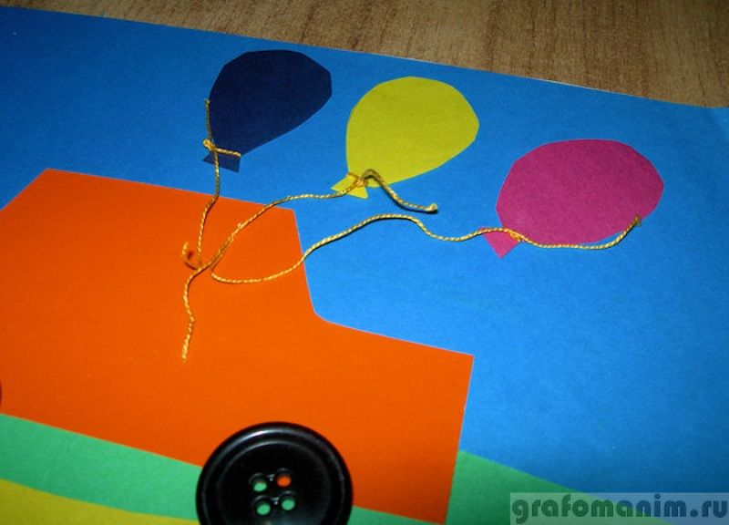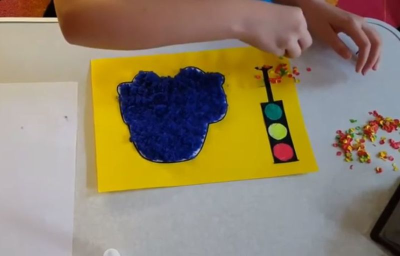 - Облаците или газовите емисии се правят с техниката на разкъсване - цветният материал се разкъсва внимателно, като детето може да създаде всяка интересна форма.