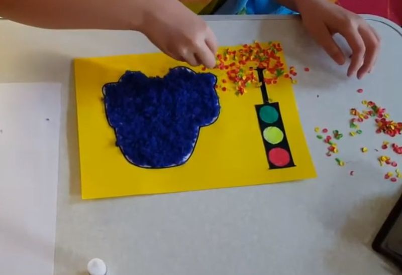 Като се разкъса, може да се добави в най-долната част, като всяка част се залепва с лепило за моливи. Всички части първо се поставят върху основата и след това се залепват с помощта на обикновен PVA. Концепцията може да се допълни с акварелни бои, като се нарисуват облаци, къщи, слънце и др.