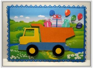 Тази версия на занаята може да бъде пълна играчка или произведение за конкурс. Техниката на тази работа е подобна на апликация за пожарна кола.