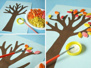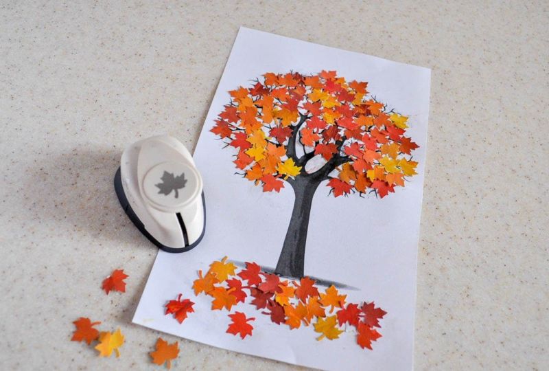 Залепете ги, за да образуват централен ствол с клони отстрани. Изрежете листа от хартия в есенни цветове с помощта на шаблон или перфоратор и ги залепете равномерно върху клоните.