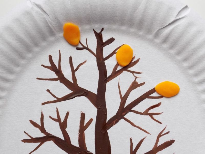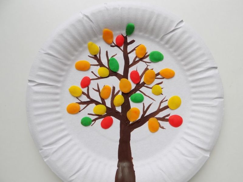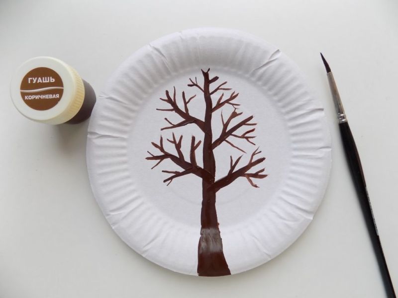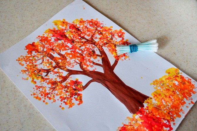 Тази техника е идеална за деца на възраст от три години. Тъй като дисковете са доста големи, този метод е по-подходящ за единични дървета. Подгответе червени, оранжеви и жълти цветове. По-добре е да използвате гваш за този занаят, тъй като акварелът ще даде по-светли тонове.
