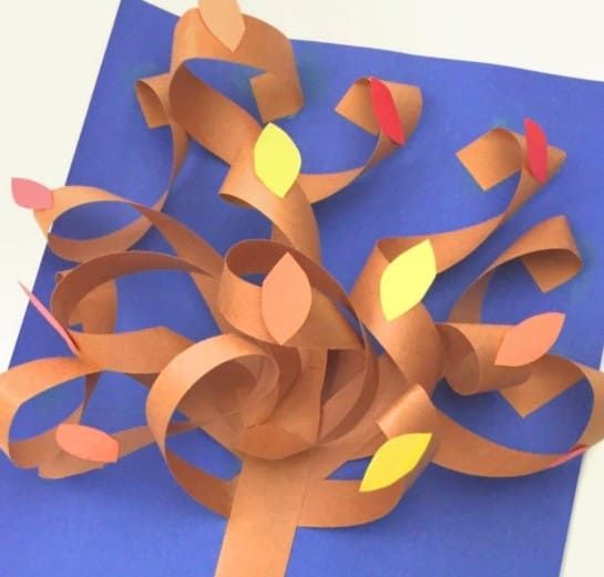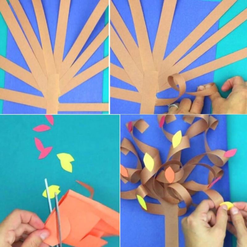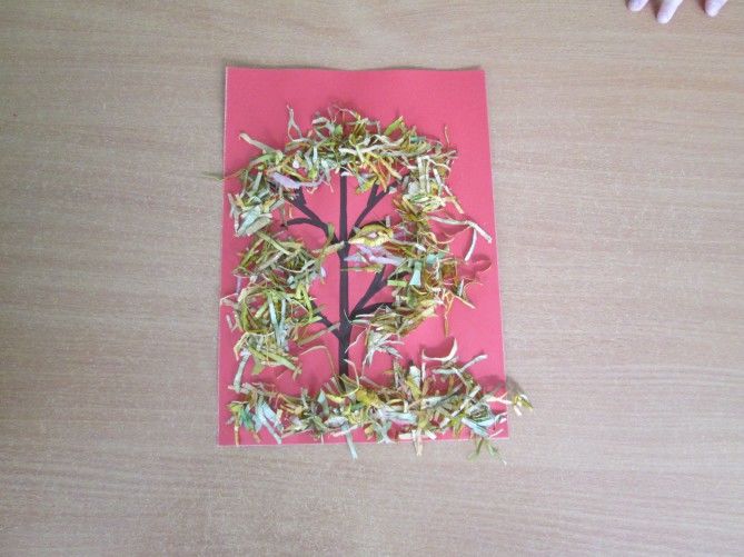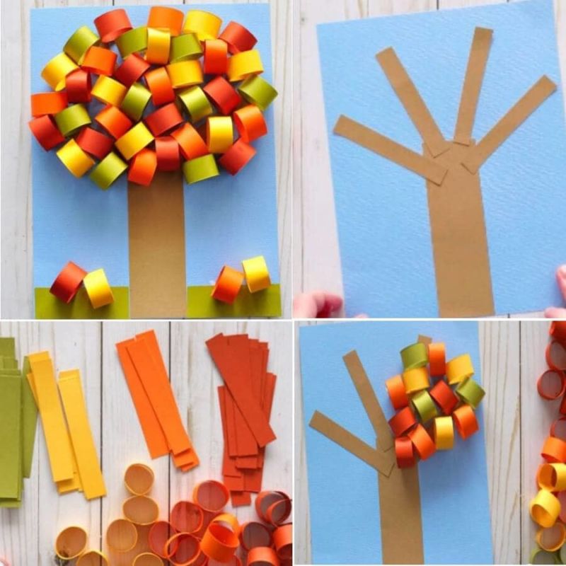 Първо: изрежете лентички с размери 1х5 см от цветна хартия в есенни цветове. Всяка лента се залепва на пръстен с оцветената страна навън. Залепете получените пръстени отстрани на багажника в произволен ред. Опитайте се да лепите така, че линията на съединението да е скрита в долната част.