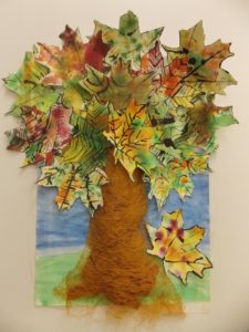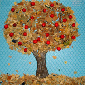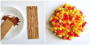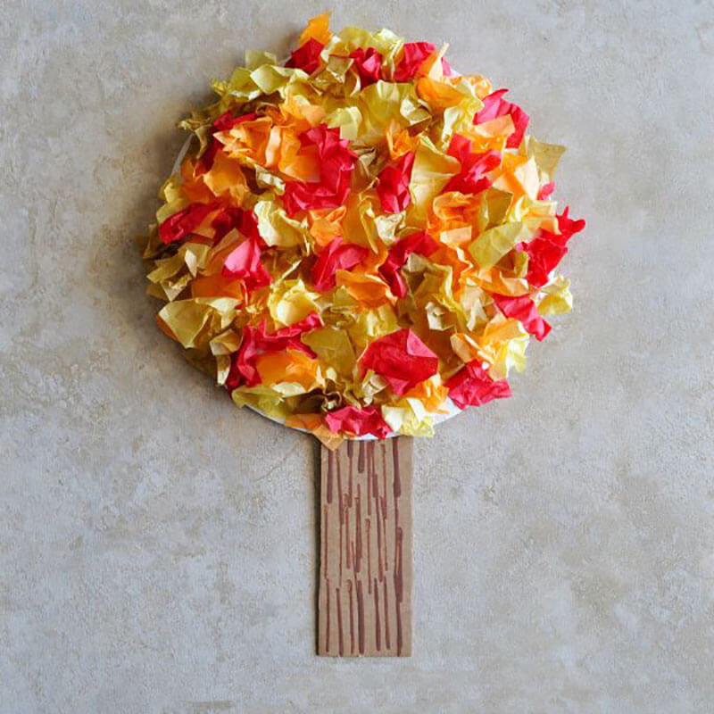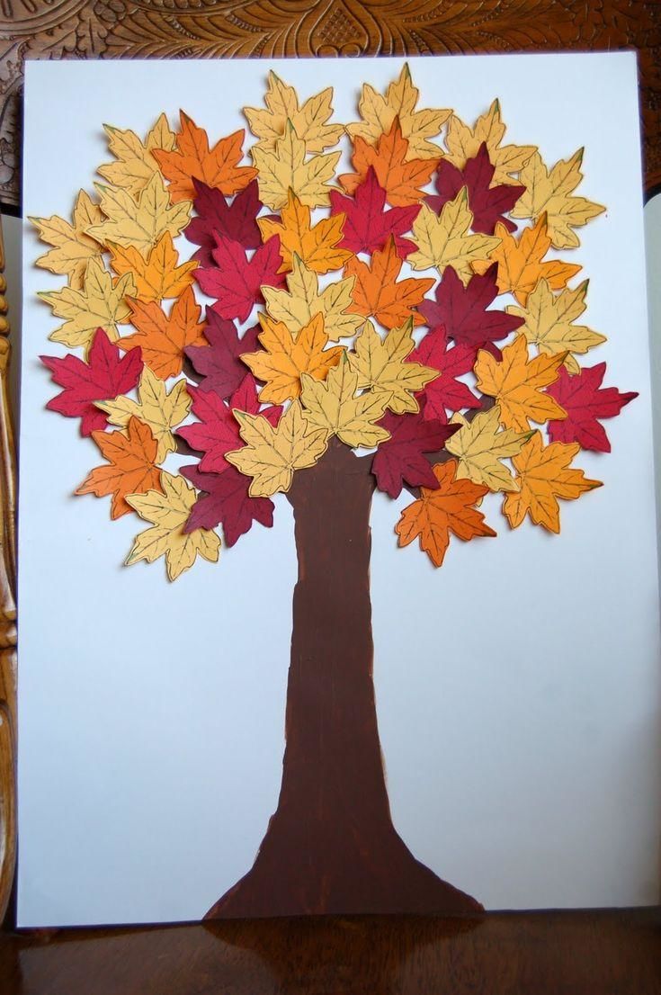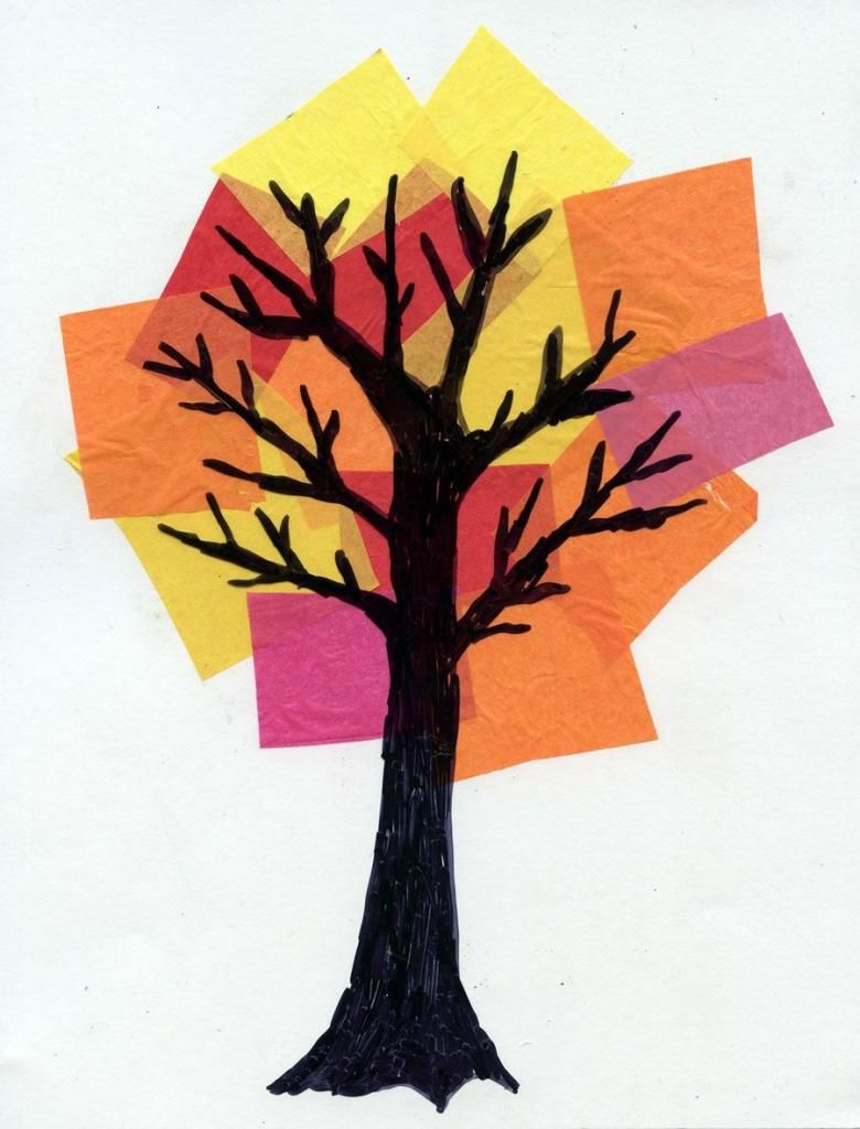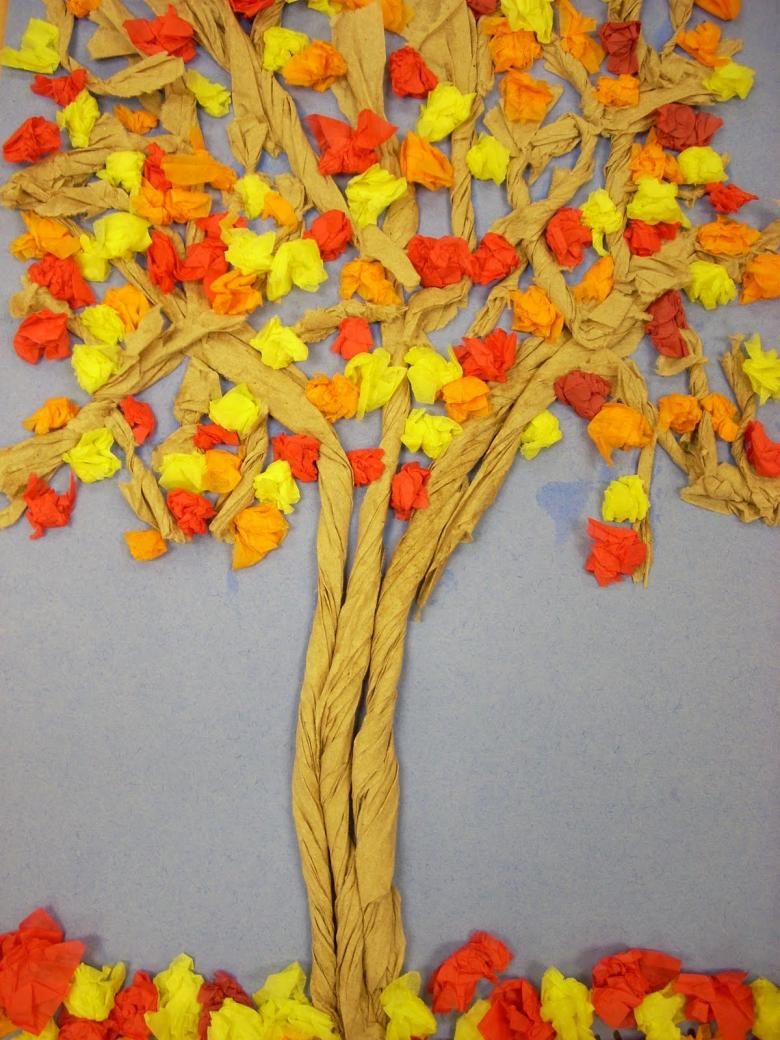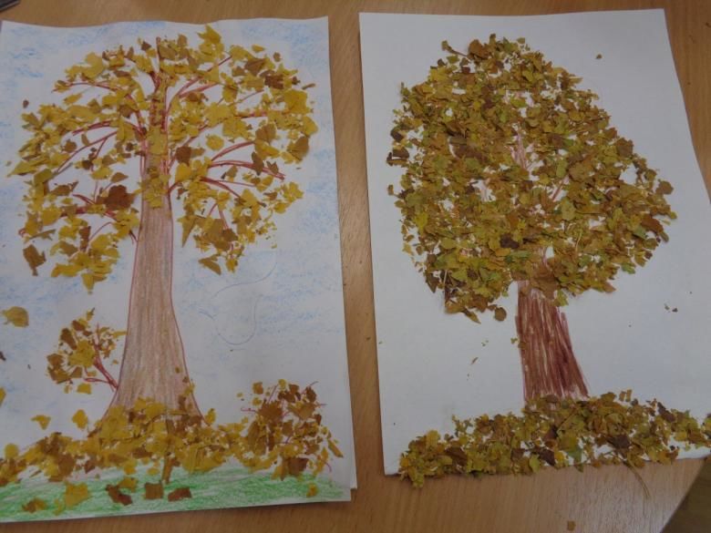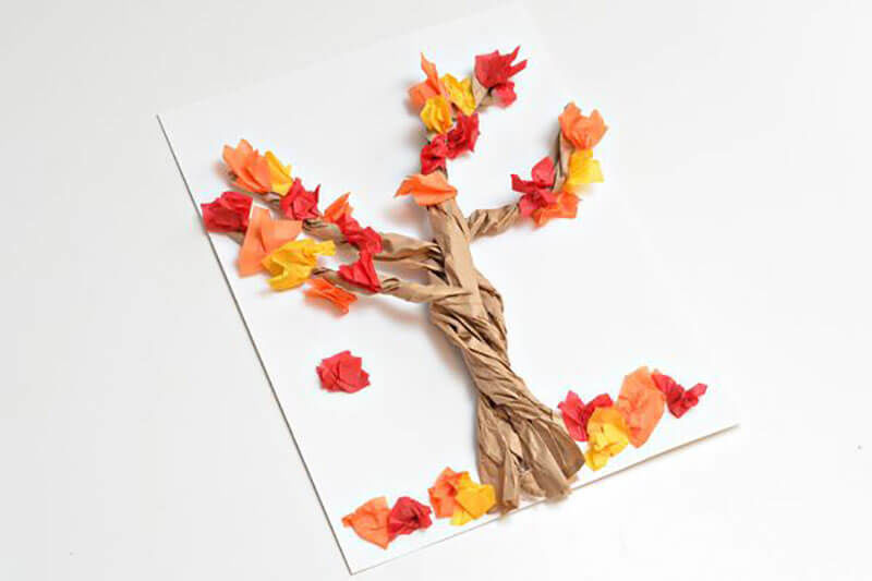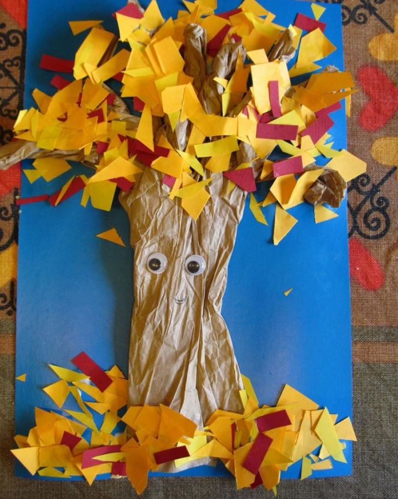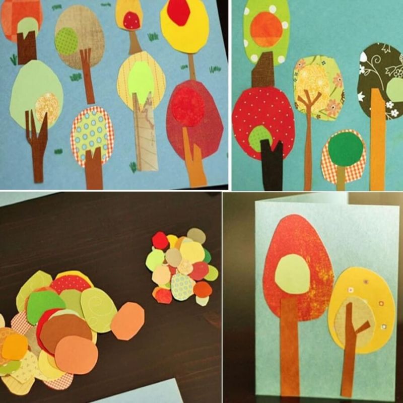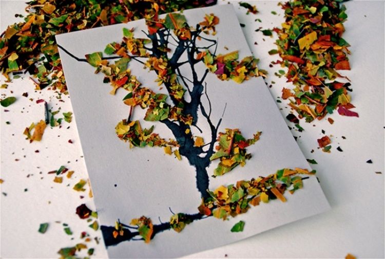 Вземете цветна хартия в нюанси на есента (червено, оранжево, жълто, светлокафяво) и я накъсайте на парчета с размери около 1х1 см. След това ги залепете произволно върху стволовете и на земята като паднали листа.