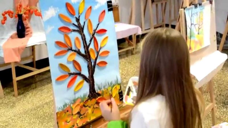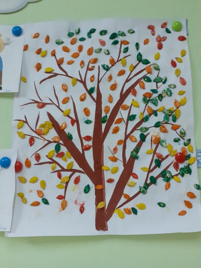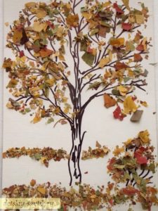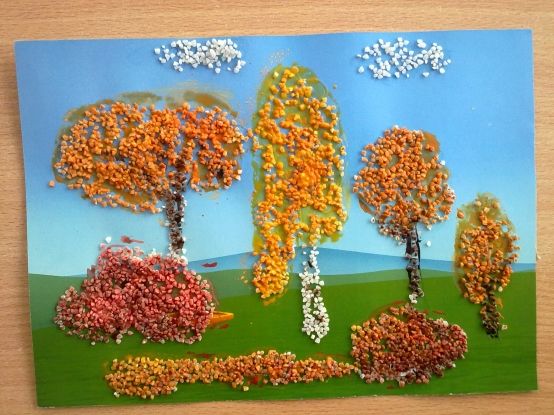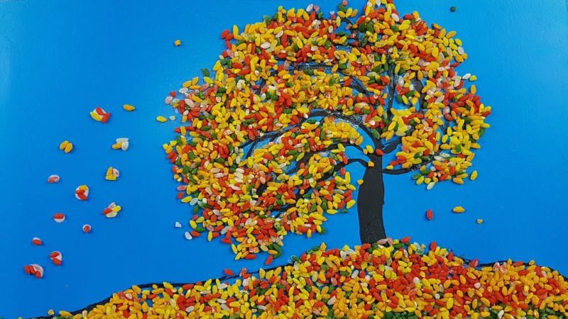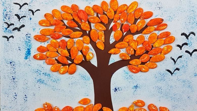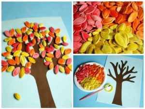 Подобен метод се използва за изработване на занаят със семена. Тиквените семки са нарисувани с гваш в цветовете на есенната палитра и след това са залепени към основата.