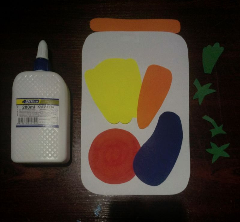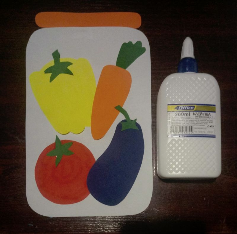 За да завършат работата, децата поставят своите приложения в стъклен буркан или ги залепват върху картонена имитация на буркан. Можете да направите занаят "Зеленчуци в саксия", като по този начин усложните задачата на децата. Например, предложете да приготвите и поставите зеленчуци в съд за борш, винегрет или салата.
