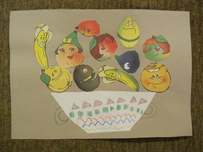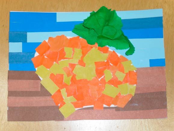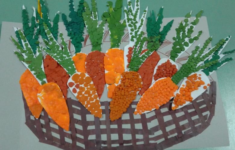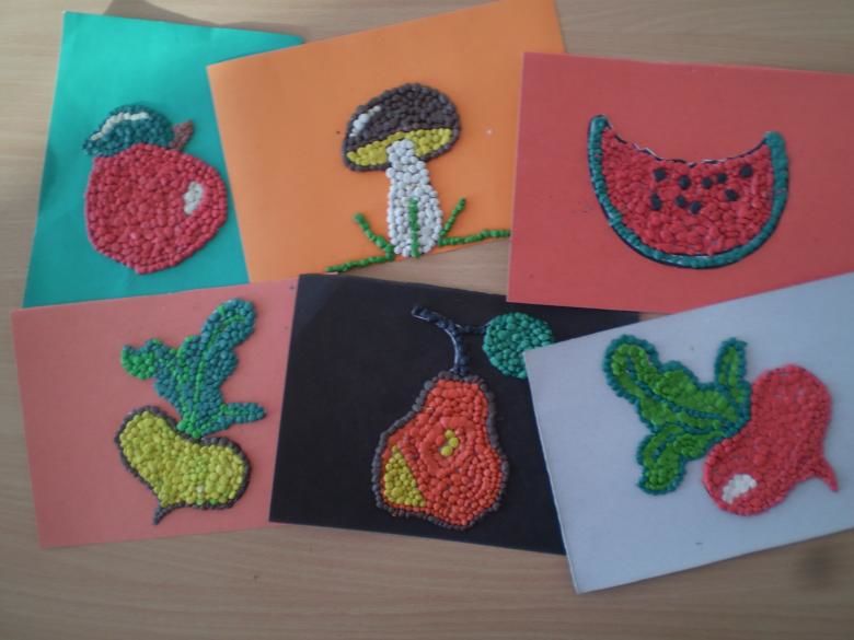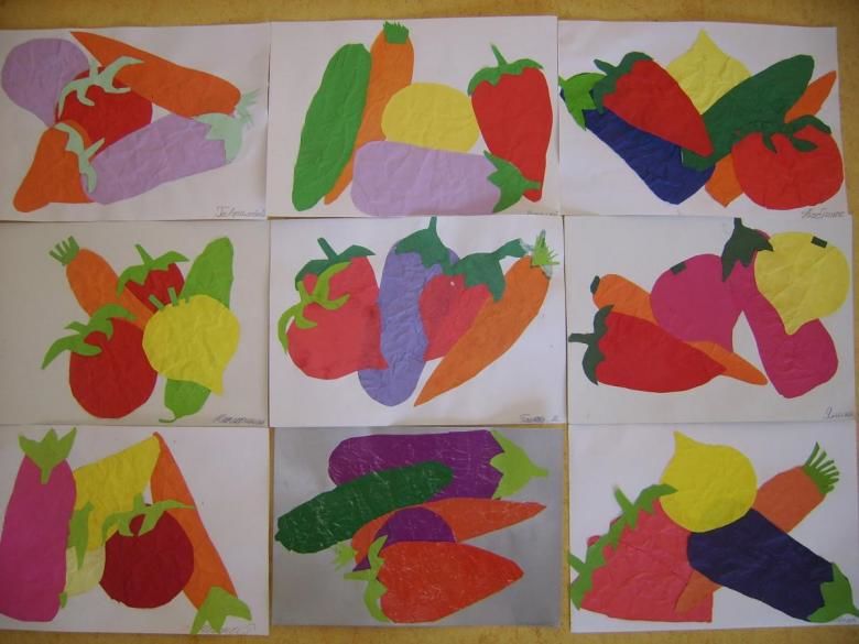 За работа в по-възрастната група могат да се използват техники за мозайка или хартия за изрезки. Детето рисува с молив зеленчука, който иска да направи, и залепва квадратчета от откъсната цветна хартия върху рисунката си. Можете да изрежете детайли за мозайка.
