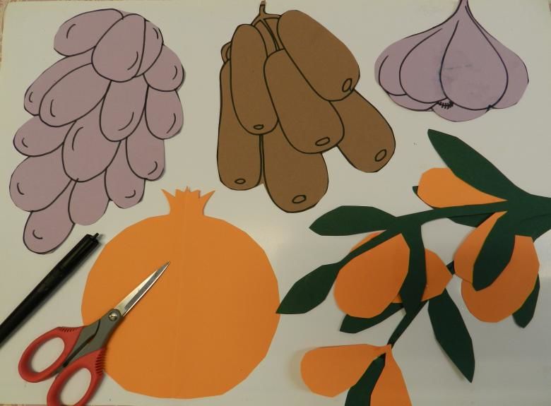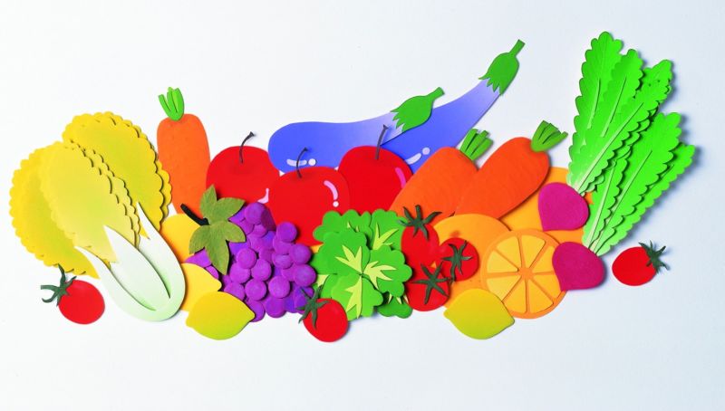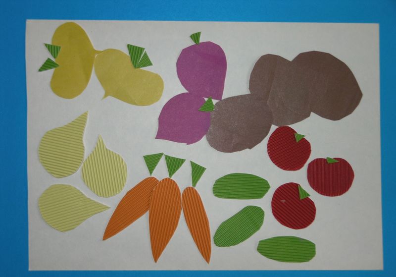 Като изрязва зеленчукови форми за своите изделия в по-горната група, детето усвоява техниката за изрязване на хартия, сгъната на две. Изрязаните по този начин обекти са симетрични и чисти в апликацията.