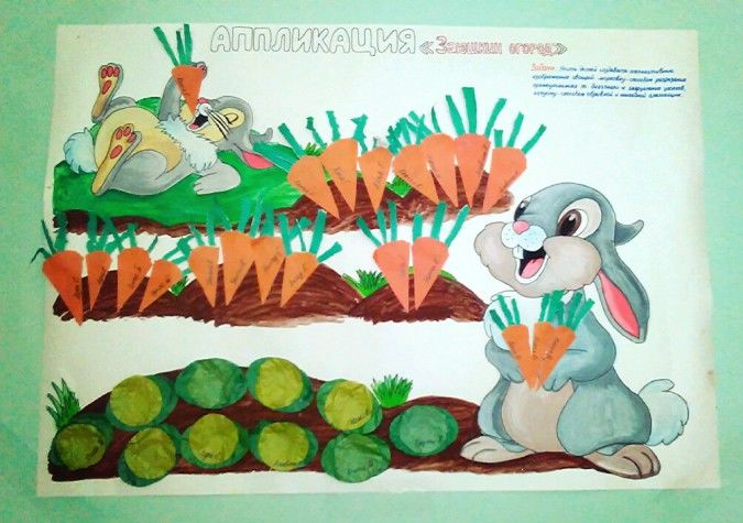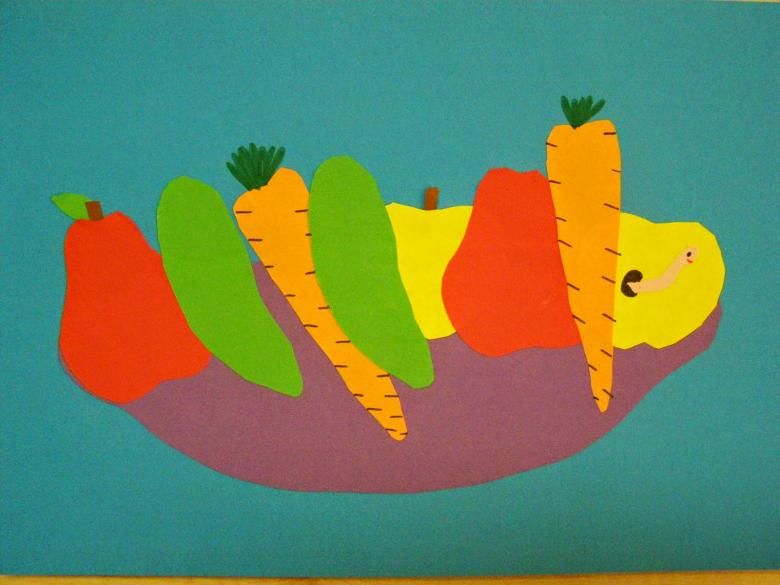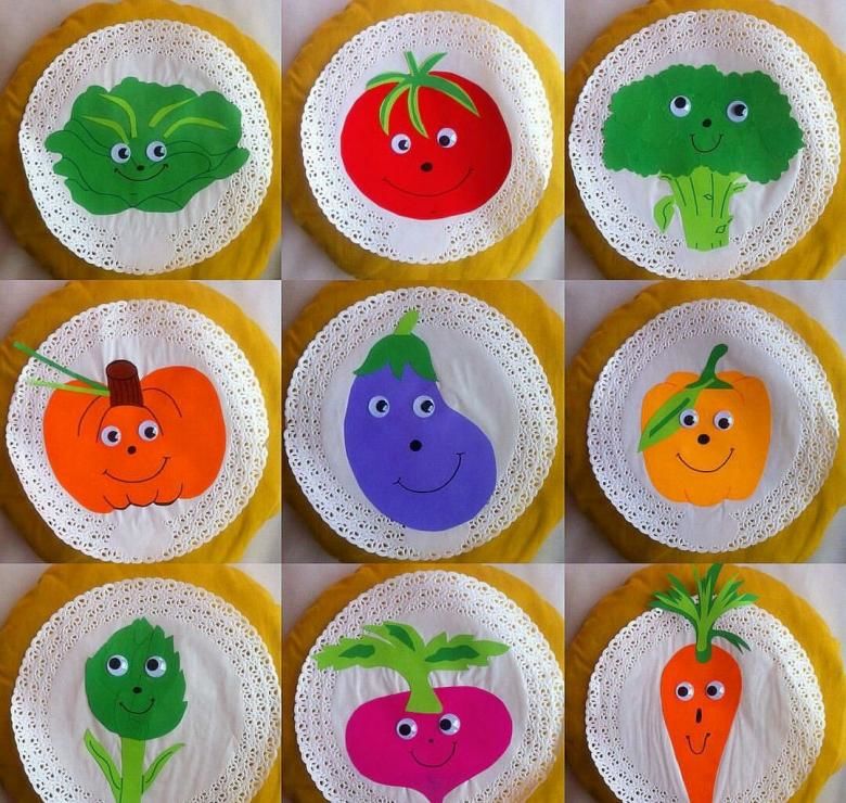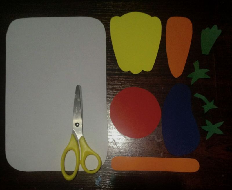 Основното при създаването на занаят с малки деца е да ги научите как правилно да поставят предметите върху лист хартия, да запознаете децата с цветовете и формите на зеленчуците.