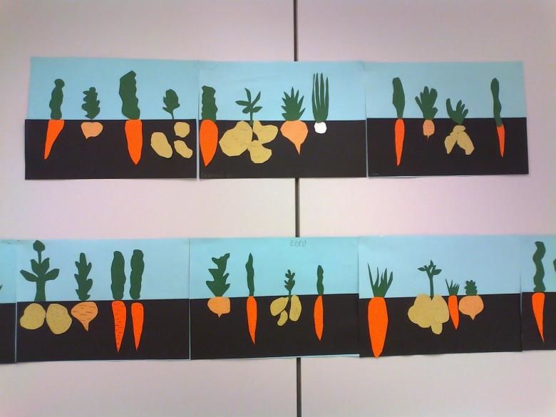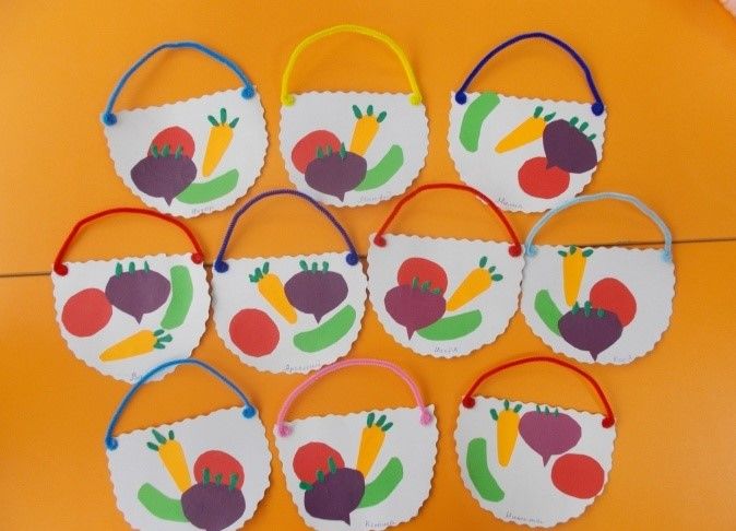 Когато се правят големи приложения, може да се организира работа по двойки. Децата се редуват да изрязват и залепват зеленчуците към основата. Тази работа насърчава изграждането на екип и чувството за отговорност.