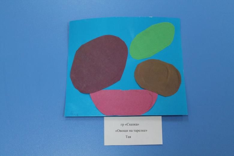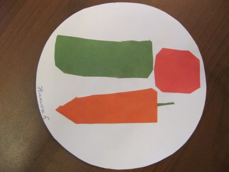 Тази работа ще бъде по-подредена. Интересният и оригинален занаят ще вдъхнови децата да направят допълнителни приложения. Можете да направите голяма колективна апликация, наречена "Зеленчуци в чиния". Всеки член на групата приготвя свой зеленчук и децата заедно оформят чиния със зеленчуци.