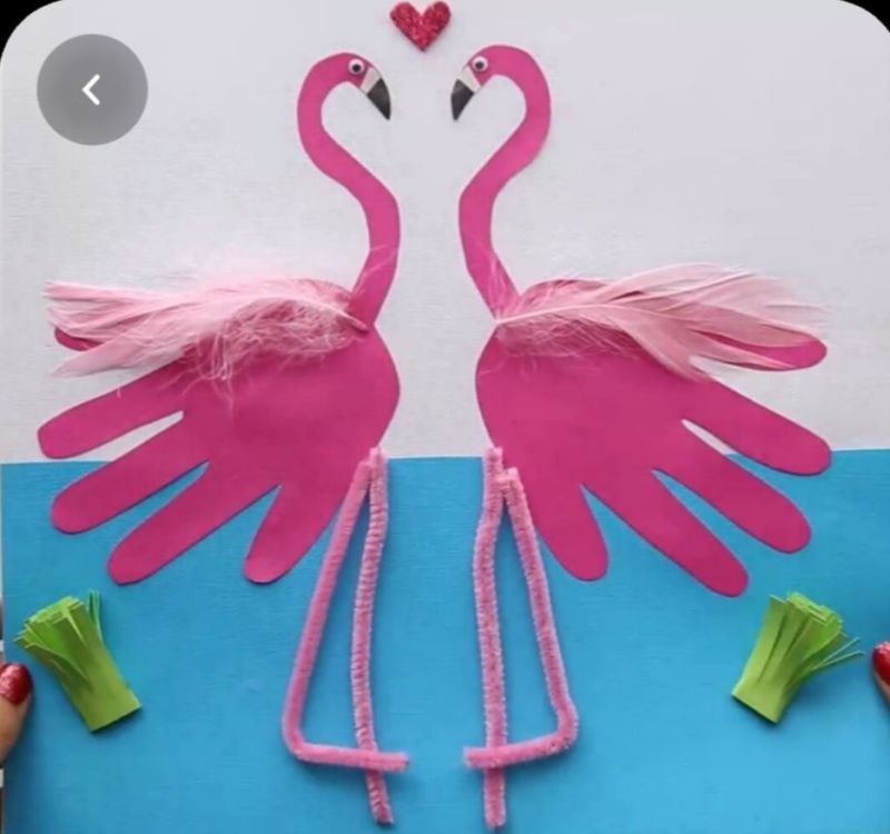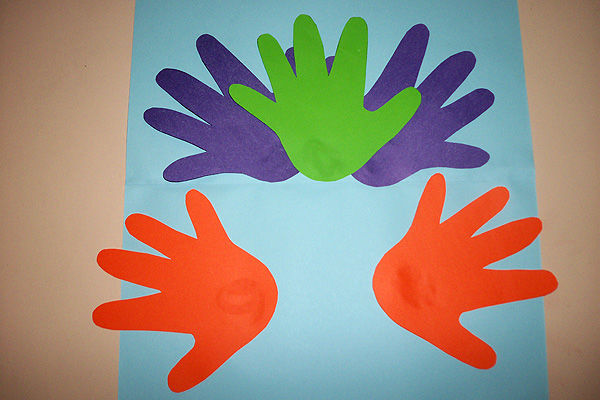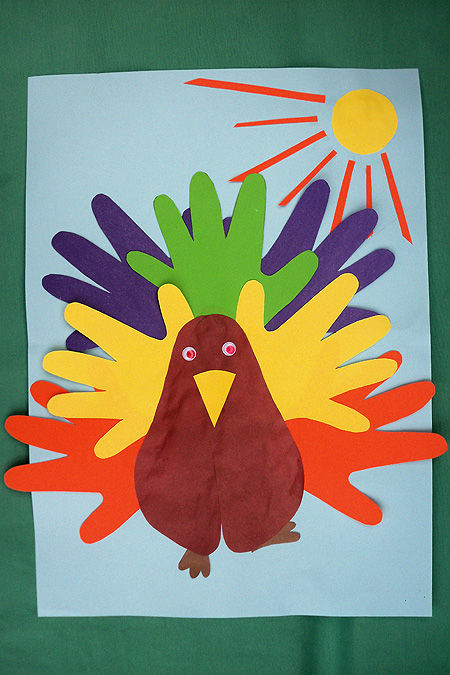Върху цветна хартия очертайте дланта на детето и повторете върху няколко листа с различни нюанси. Изрежете и залепете ветрило на гърба на птицата, за да направите опашка.