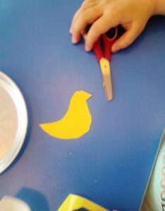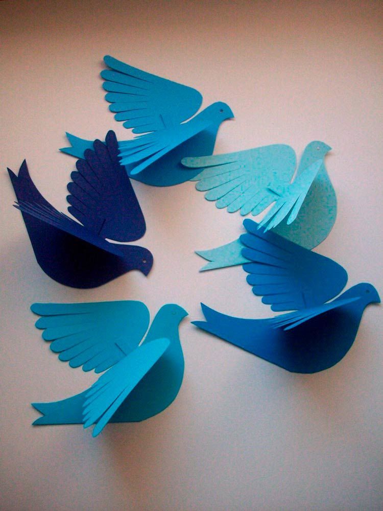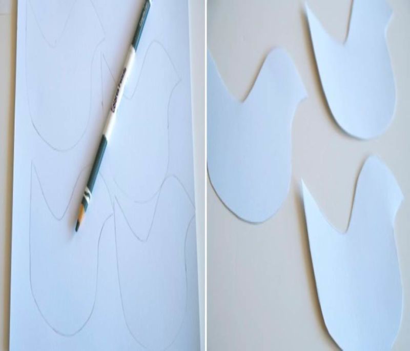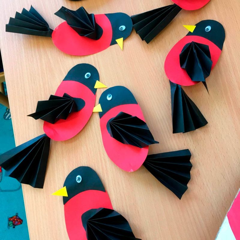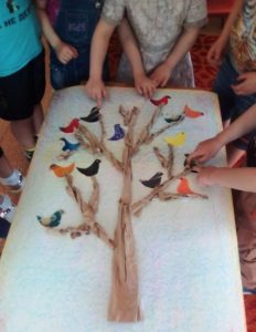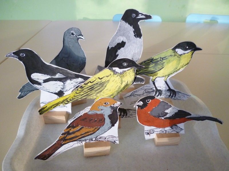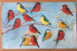 - птиците се изрязват по шаблон и се боядисват (или се украсяват с памук, конфети, мъниста и др.);