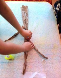 - Бялата хартия се нарязва на ленти, които ще бъдат стволовете на брезите, и на различни места по височината им се нанасят хоризонтални чертички с черен маркер;