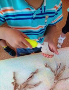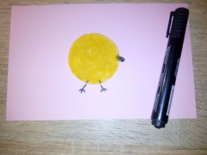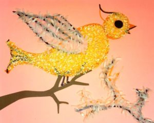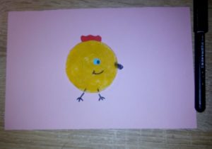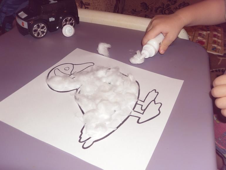 Първо се очертават контурите на тялото, главата, крилата и опашката с флумастер. След това се навиват малки топчета памучна вата и се залепват с лепило вътре в контура. Когато цялото изображение е запълнено, памучната вата може да се боядиса. Детайлите могат да се изработят и от пластилин.
