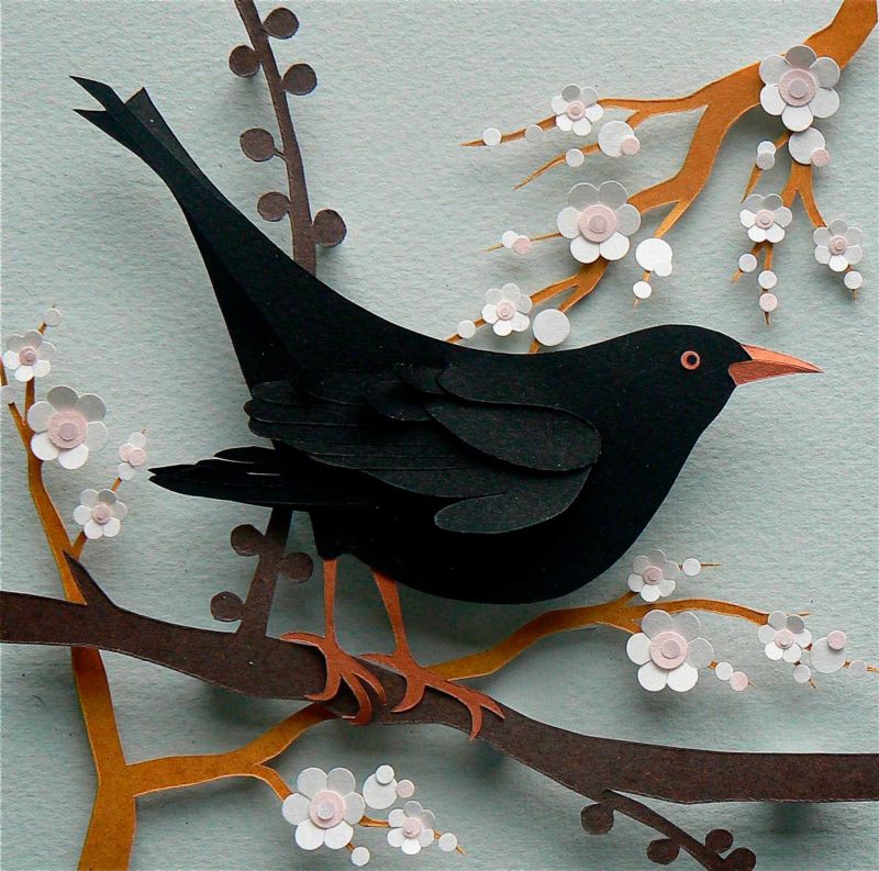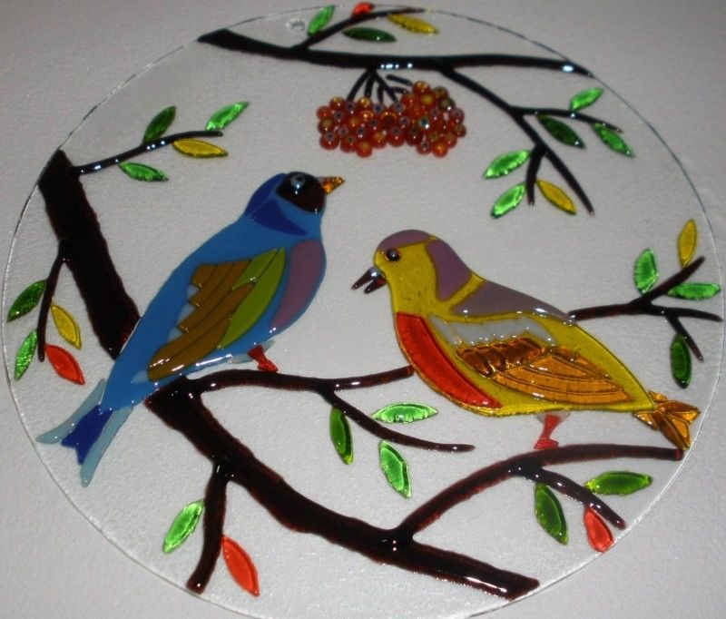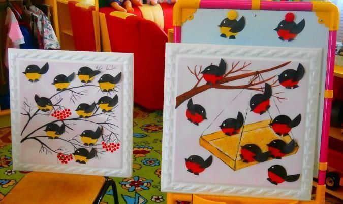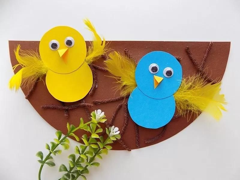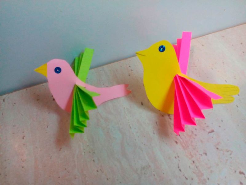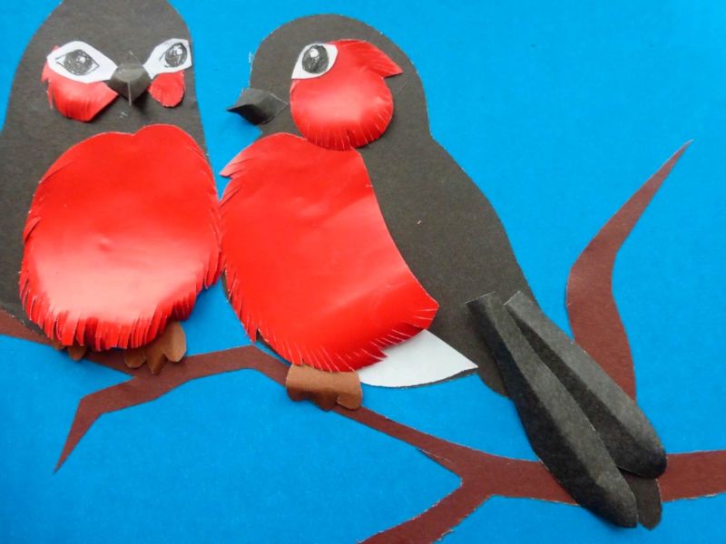 Можете да изрежете птици за апликиране от цветна хартия, като очертаете контурите на крилата, човките и очите. Фигурите са залепени към основата - готово!